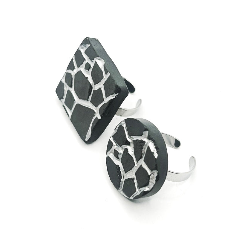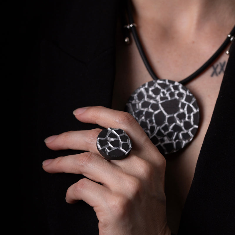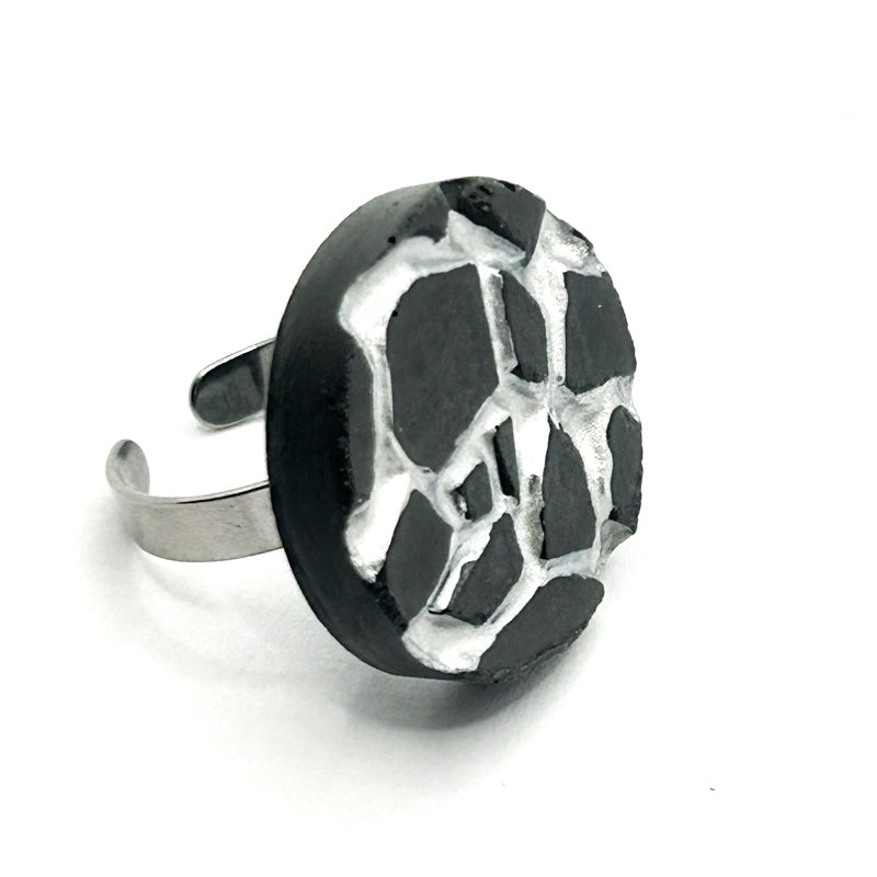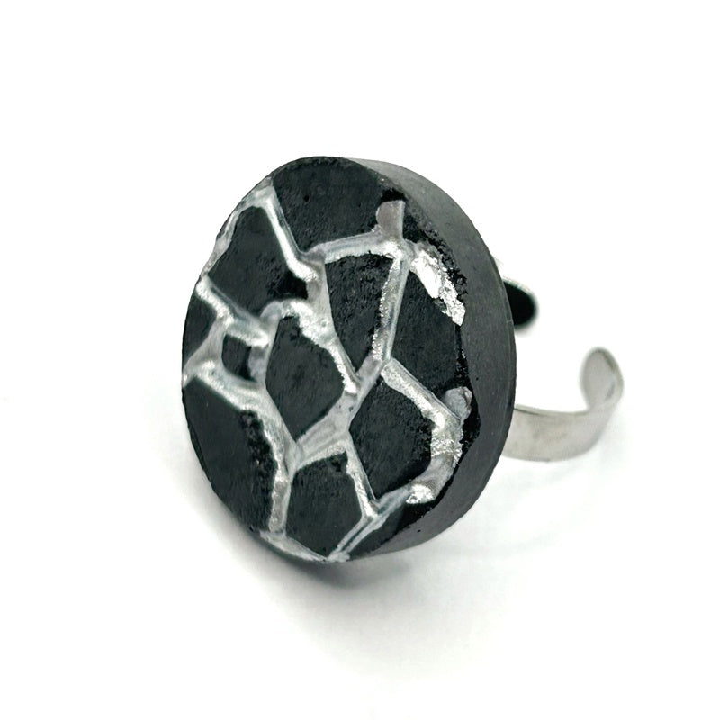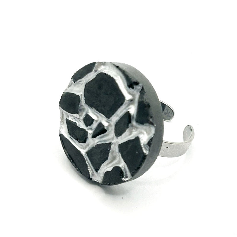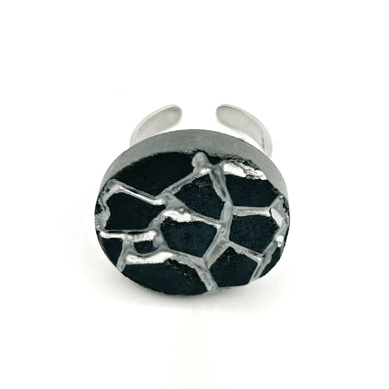 This round ring from the Patti series is made of concrete tinted black throughout. The silver network that runs through it evokes Japanese pottery repaired using the kintsugi technique, to enhance the breakages. A unique designer piece.