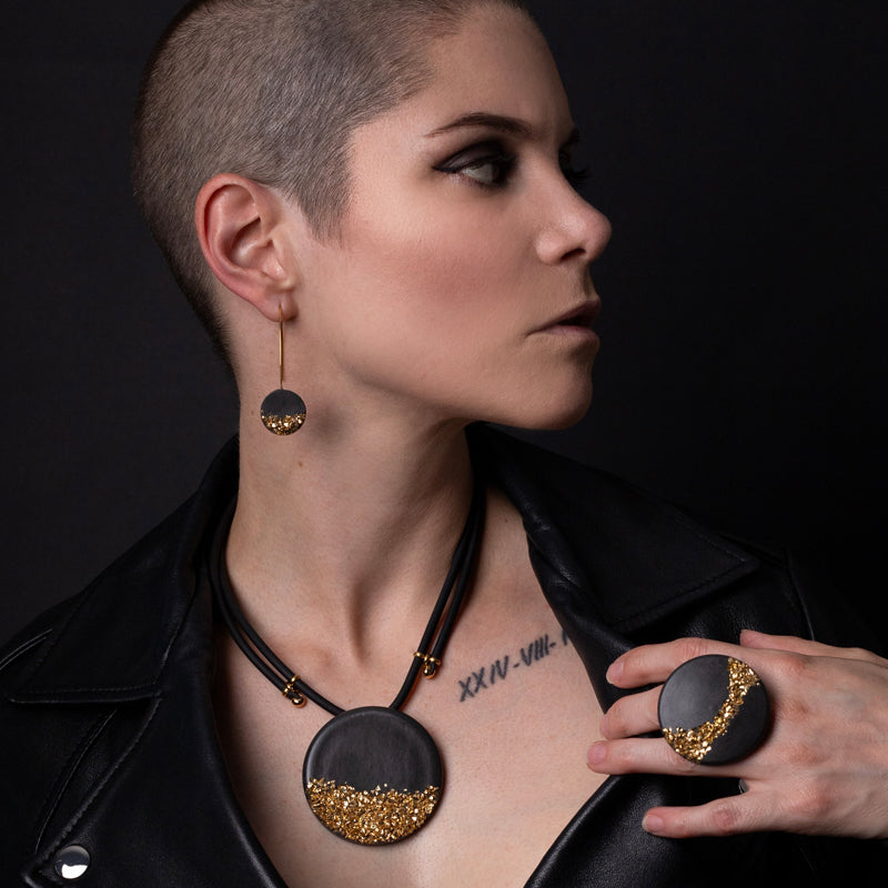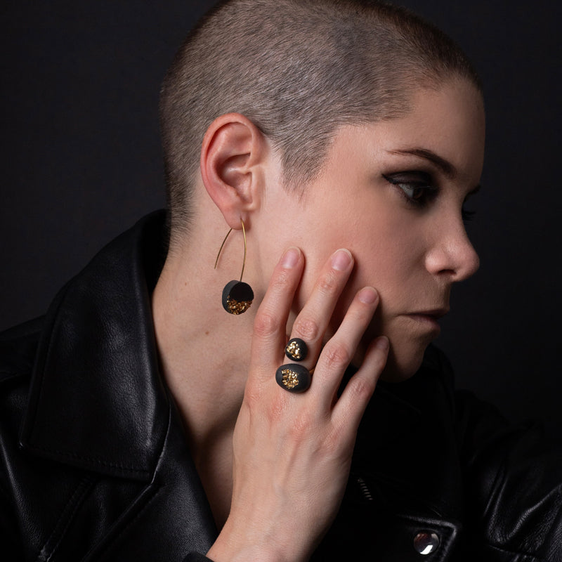 Between strength and brilliance, these round earrings from the Justine collection combine the raw character of black concrete with the delicate sparkle of golden crystals. Their circular shape softens the contrast of materials, creating a jewel that is both refined and bold. A subtle play of light to illuminate your style.