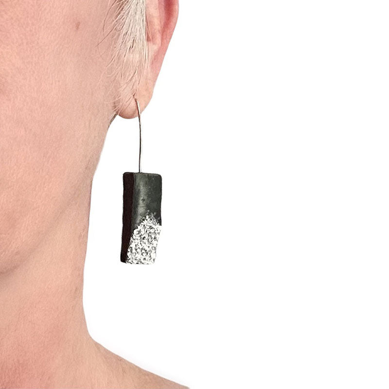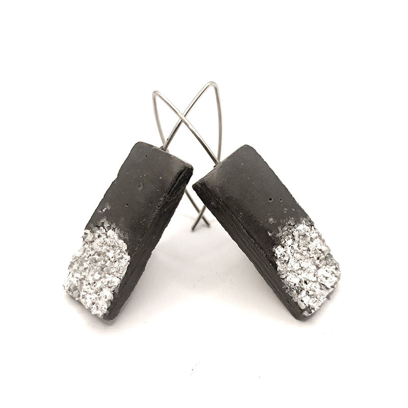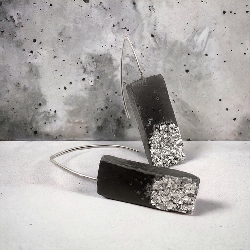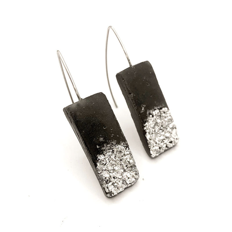 The rectangular-shaped Diane black concrete earrings feature a sand print in their lower part delicately covered with silver leaf to add a touch of sparkle and reflect light in a subtle way.