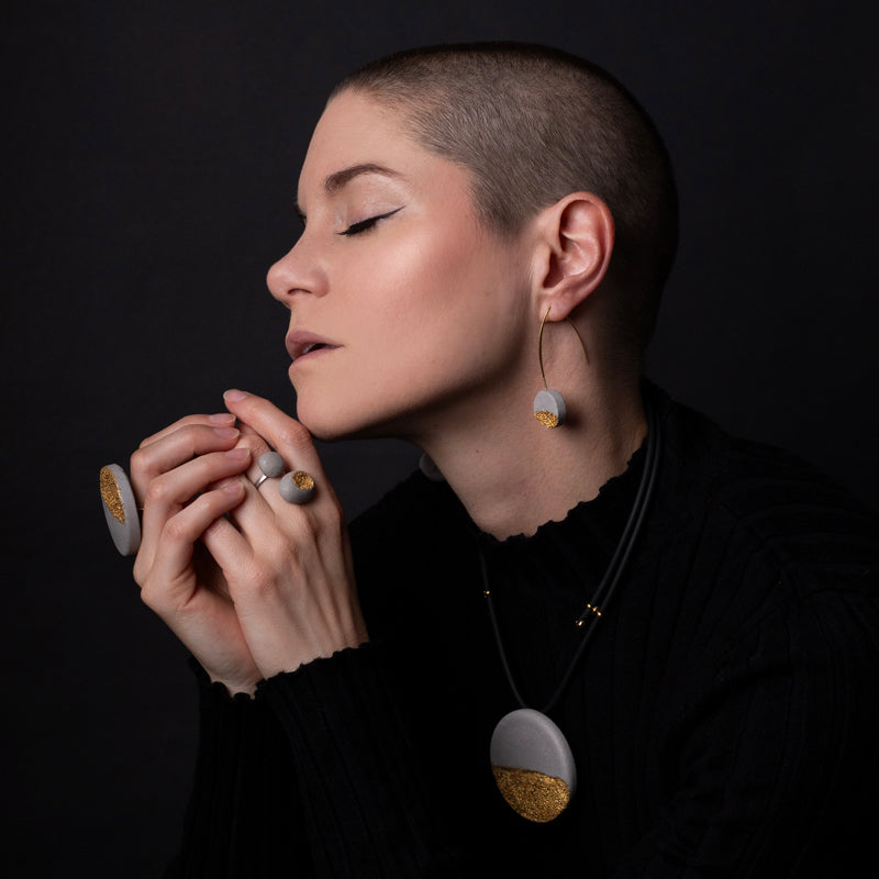 Care: Concrete is a solid but breakable material, so avoid hitting it. You should also avoid putting the metal parts of the jewelry in contact with water and cosmetic products to prevent them from tarnishing.