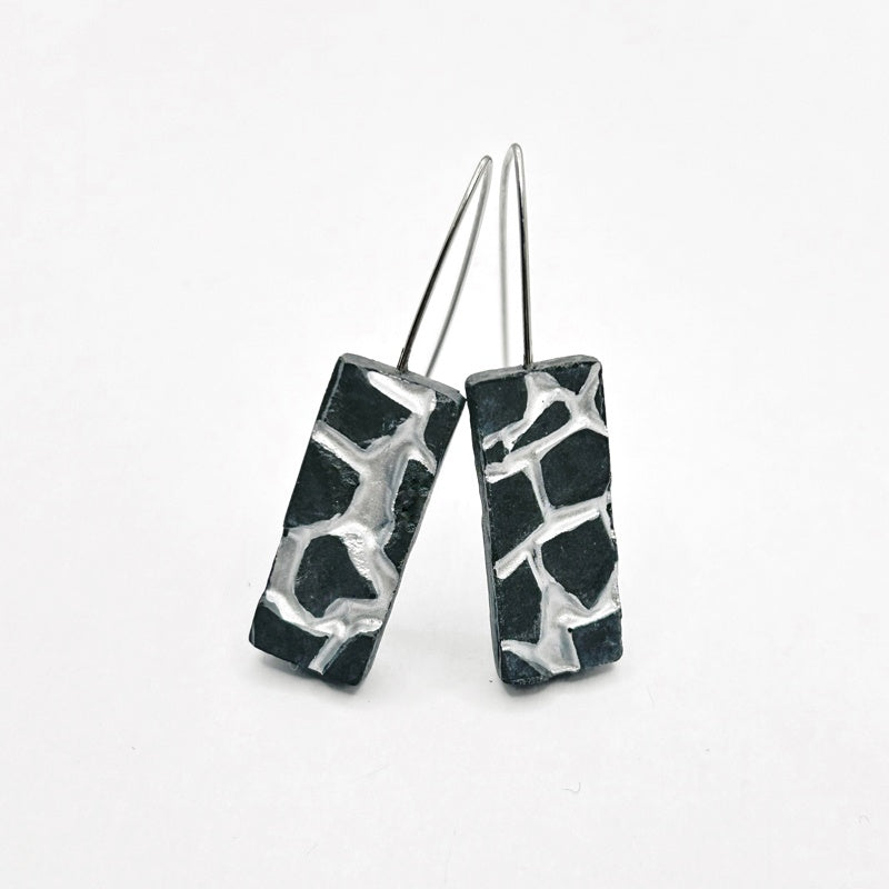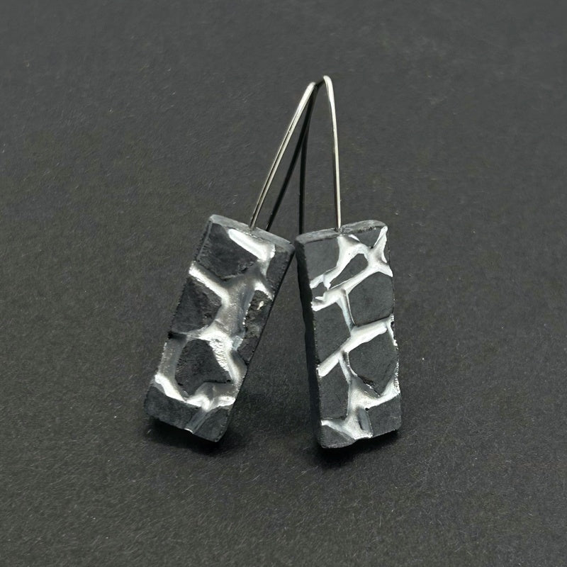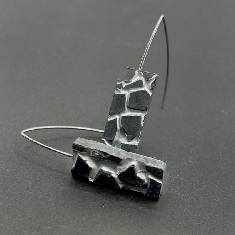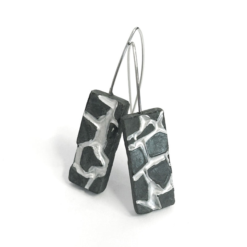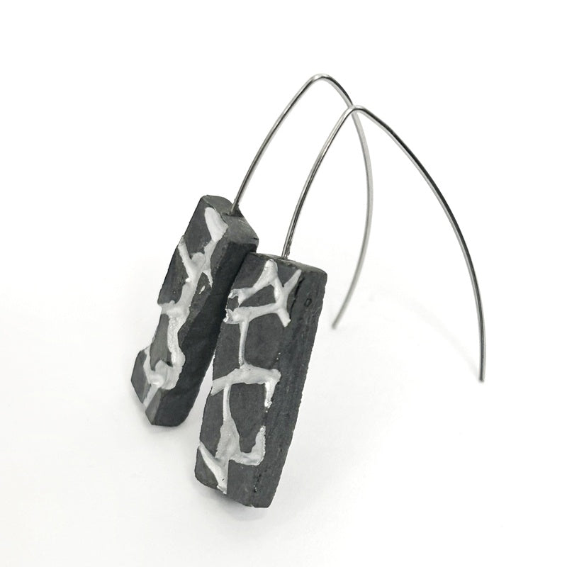 These earrings, both light and graphic, are shaped in black concrete and enhanced by a delicate silver network reminiscent of the Japanese art of kintsugi. Unique and refined jewelry that will not fail to cause a sensation.