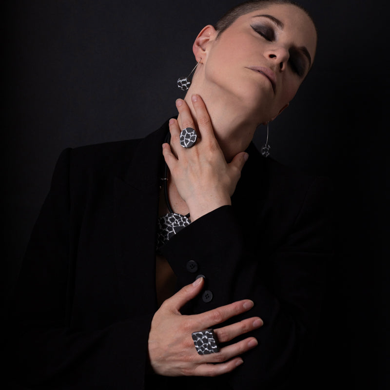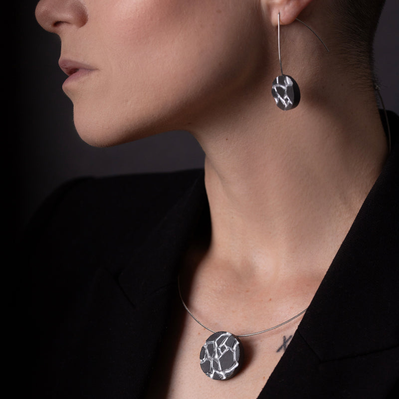 These very light and graphic earrings made with black concrete are covered with a silver network that evokes the Japanese technique of kintsugi. Guaranteed effect with these atypical and elegant jewels.