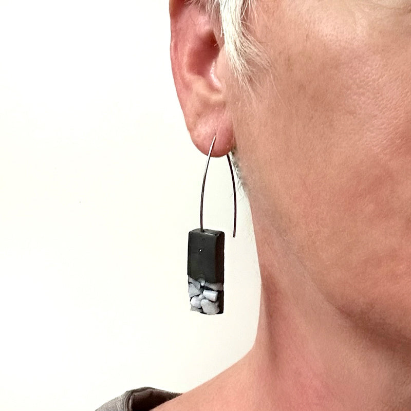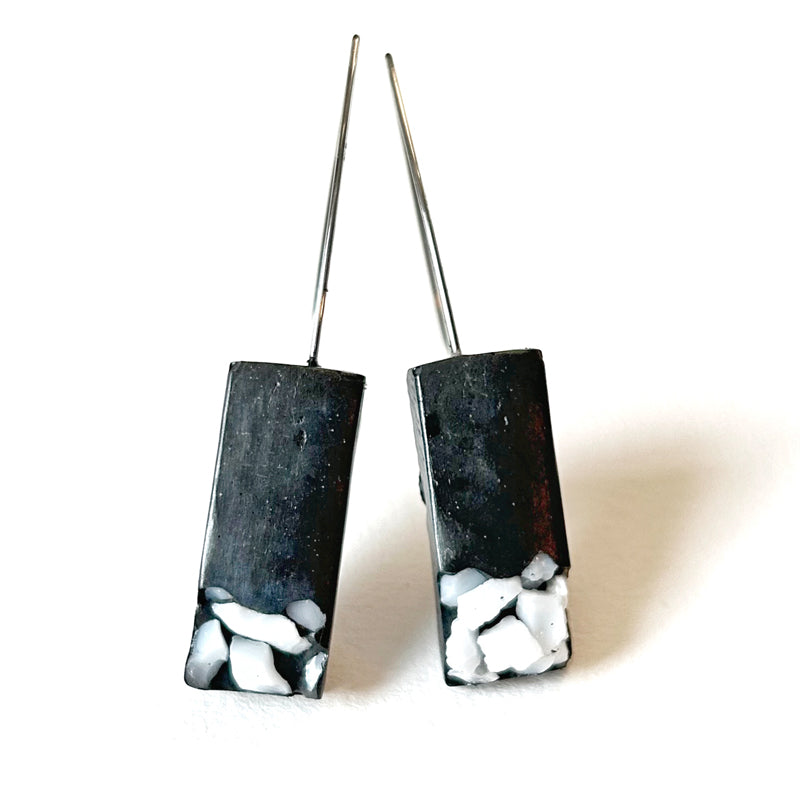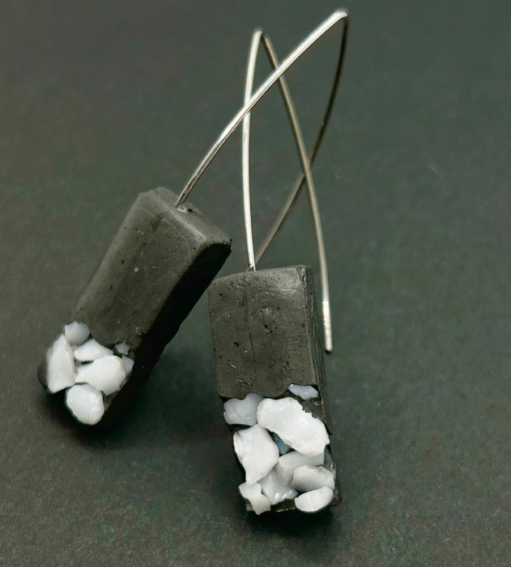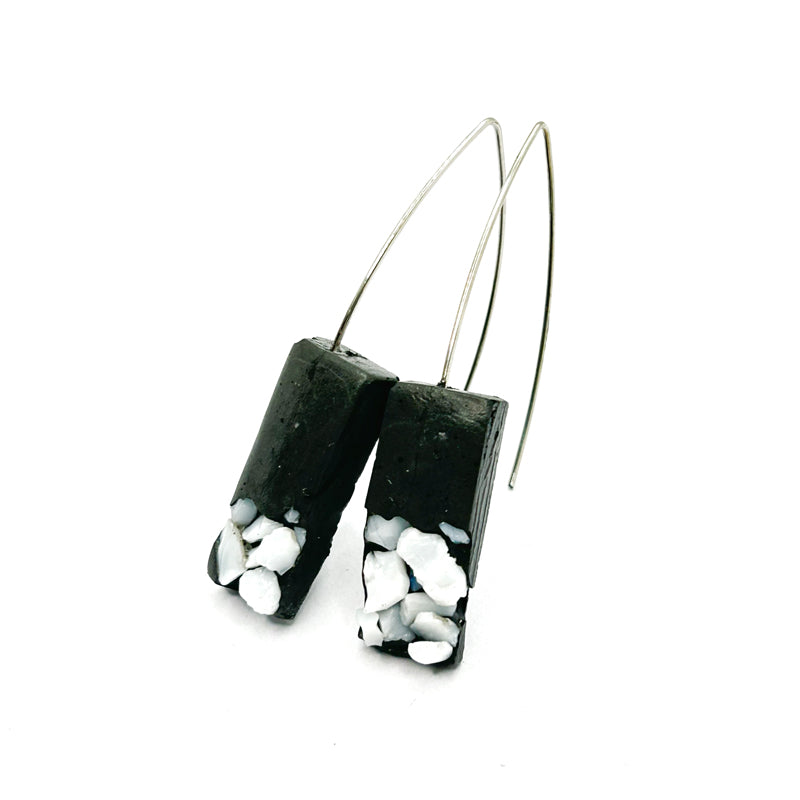 These graphic earrings combine the depth of black concrete with the clarity of white glass. Their irregular inclusions bring each piece to life, subtly reflecting the light. Their sleek design allows them to be worn with both a simple outfit and a more statement look.