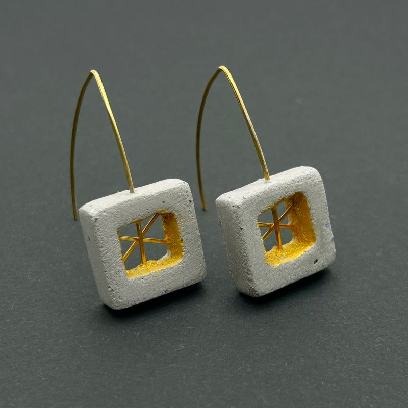 The square earrings from the Paloma collection explore the essence of reinforced concrete, where structure becomes ornament. In each piece, a sculpted hollow reveals three intertwined metal rods, like a bare armature. They interact with the irregular walls of the hollow, illuminating the raw material. A collection where architecture meets craftsmanship, between strength and delicacy.