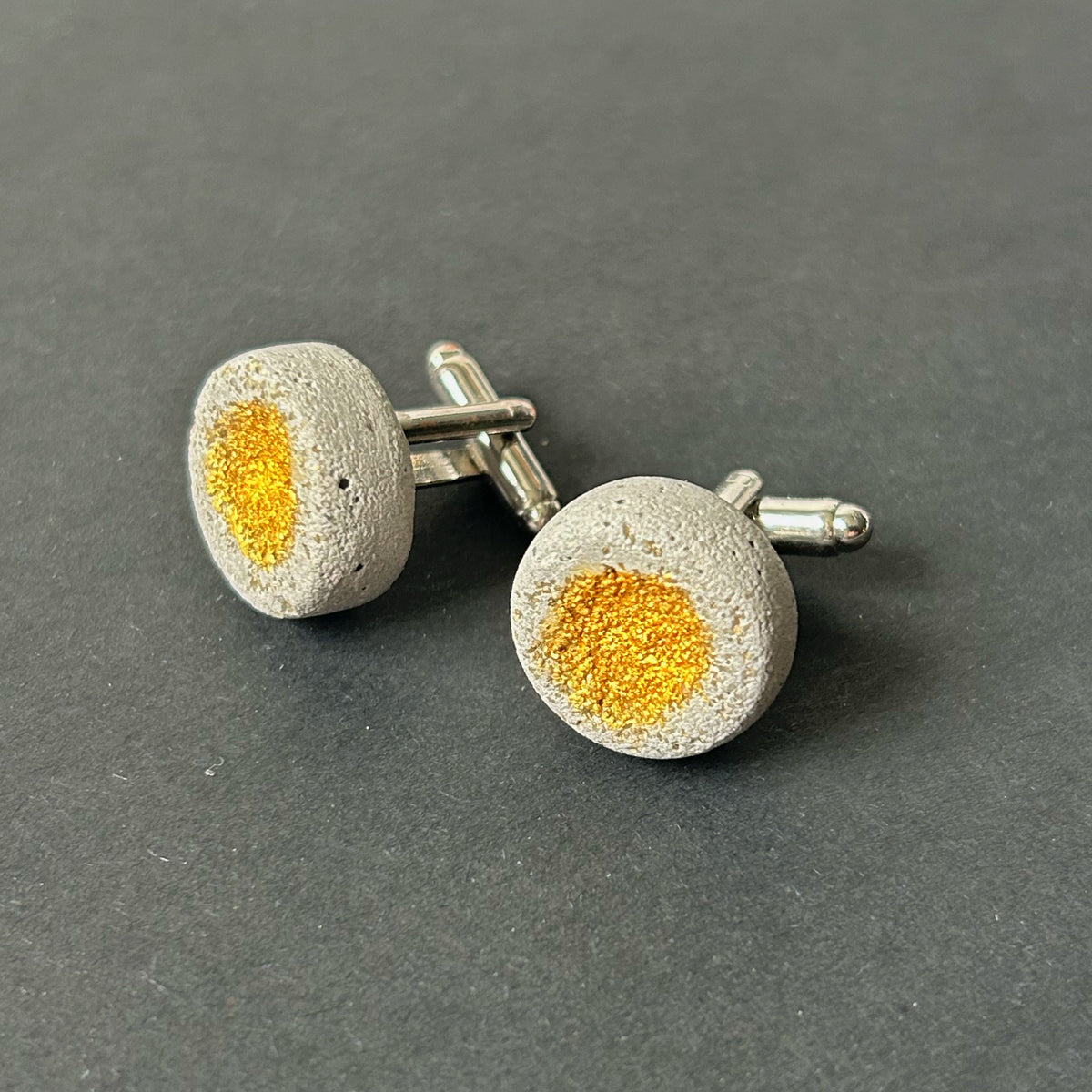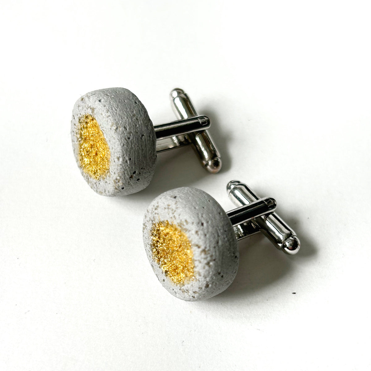 These cufflinks are made of concrete with a sand imprint overlaid with 23-carat gold leaf. Sanding reveals the grains, creating a unique texture, between raw material and refined lustre.