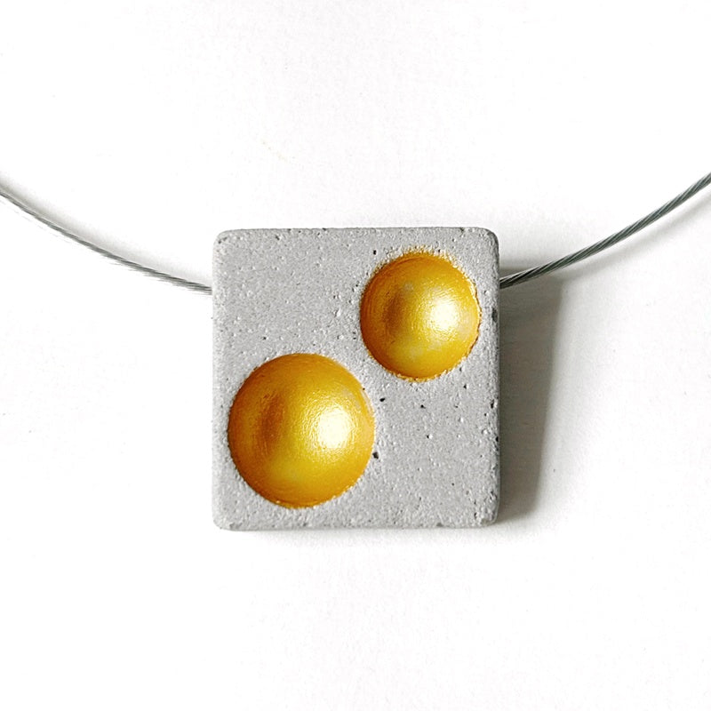 In this square necklace, the golden hollows of the concrete play with light and illusion. The raw beauty of concrete is revealed through geometric, universal shapes.