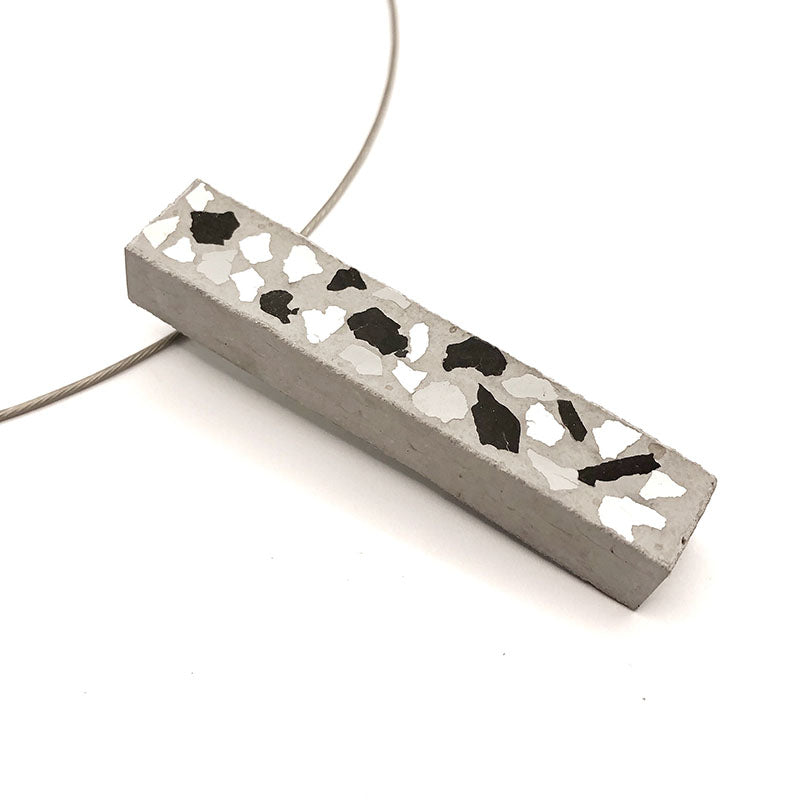 The Caroline necklace is a piece of concrete whose front face is covered with paint chips in shades of black, gray and white, creating a small abstract painting. The paint chips are deposited one by one by hand, which makes each pendant slightly different.