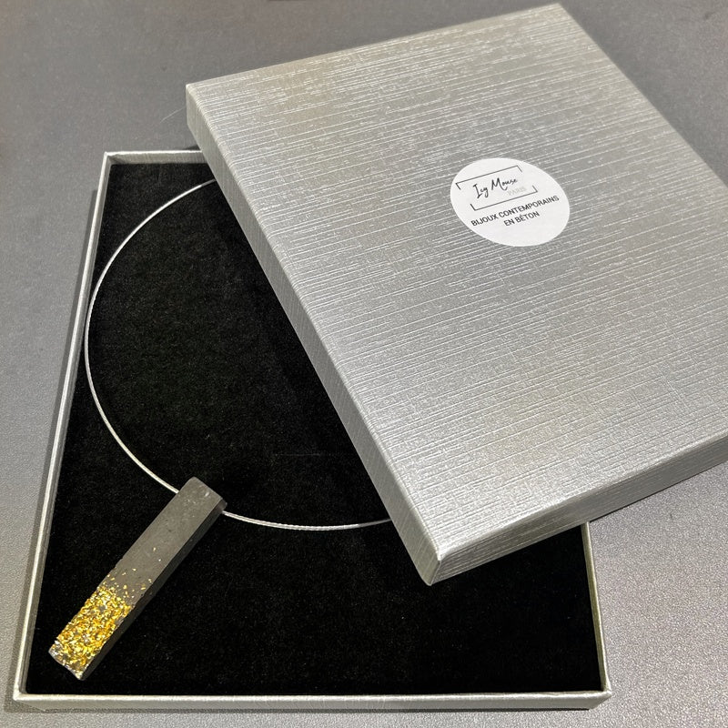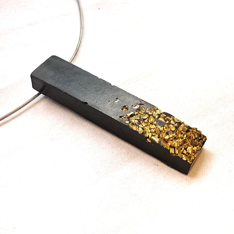 The Justine rectangle pendant in black concrete with golden crystals on its lower part is a jewel that is both original and surprising. The golden crystals that adorn its lower part add a touch of preciousness and shine to the whole.