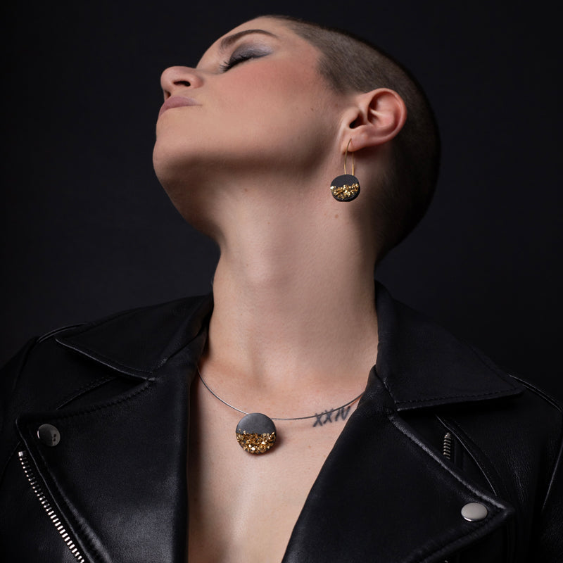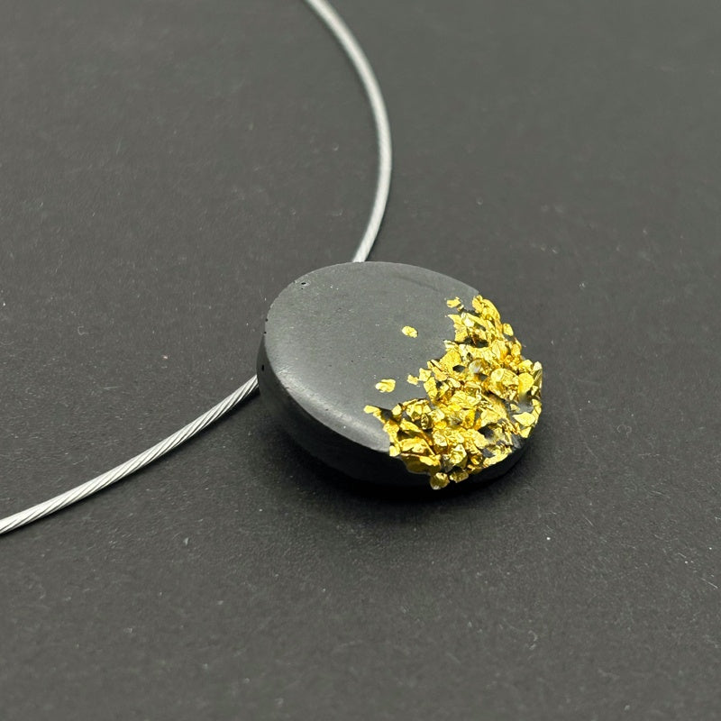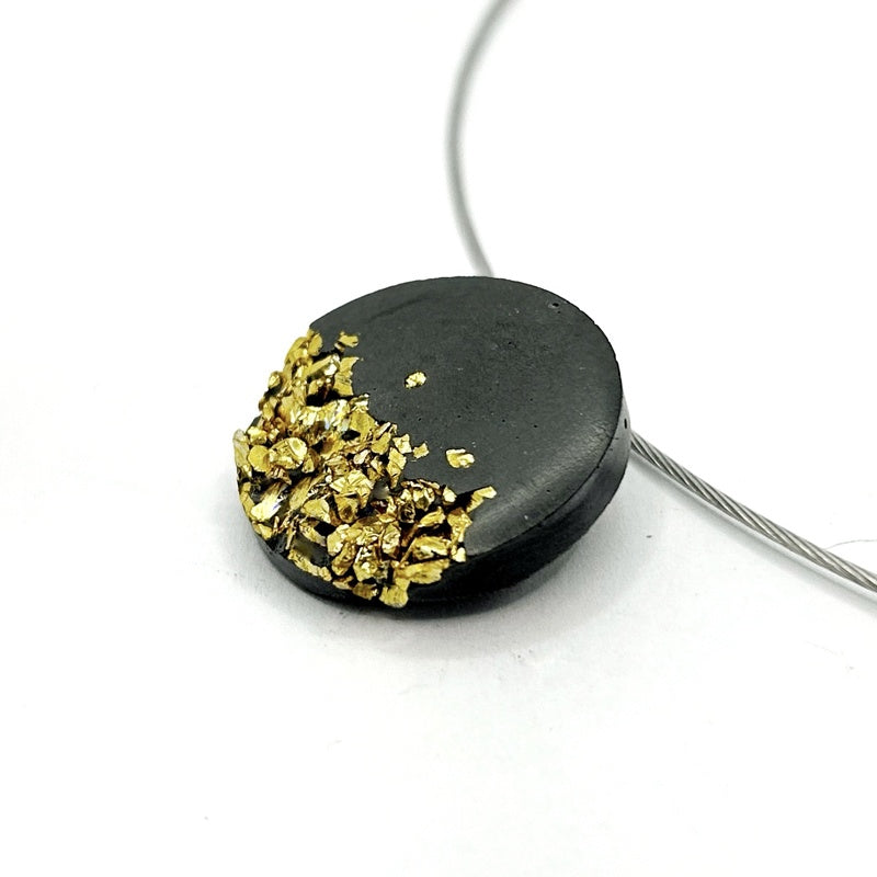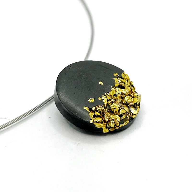 This round pendant in black concrete captures the golden glow of crystals frozen in the raw material. Its sleek design plays on the contrast between the depth of the concrete and the subtle shine of the inlays, evoking a landscape between shadow and light. Suspended from a steel cable, it asserts a contemporary and bold aesthetic, between minerality and refinement.