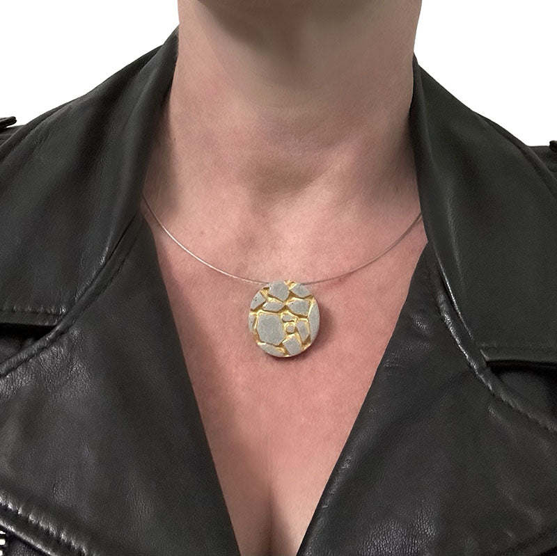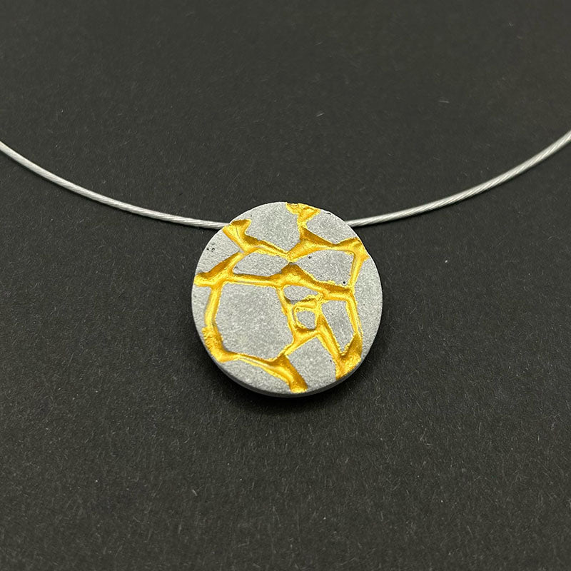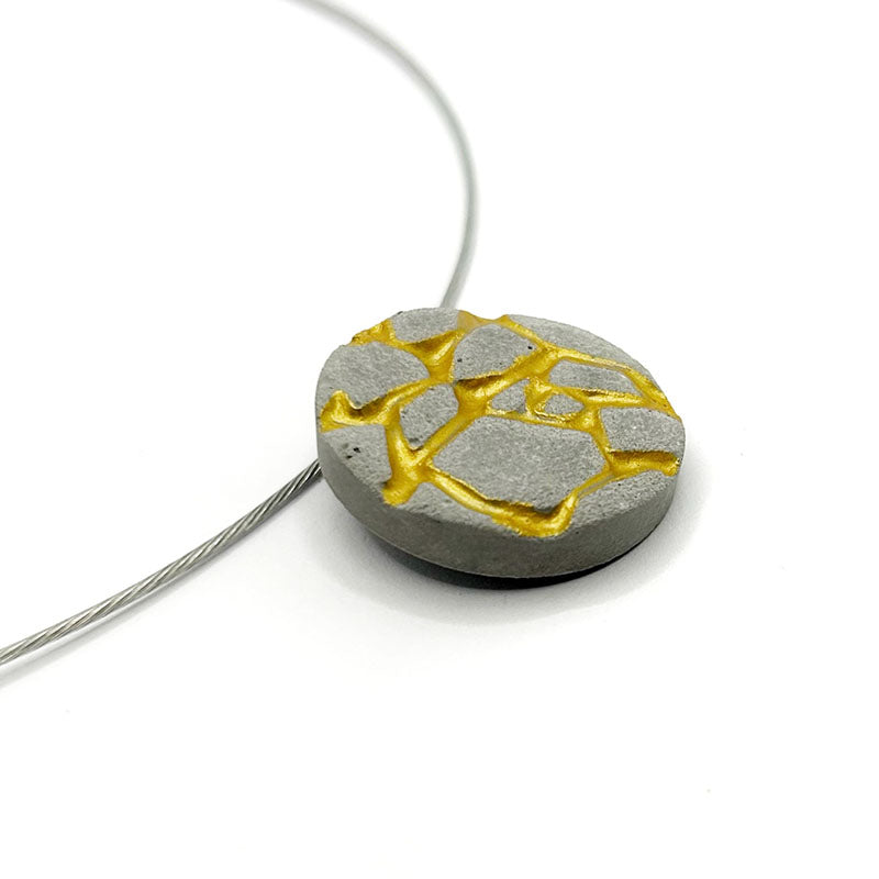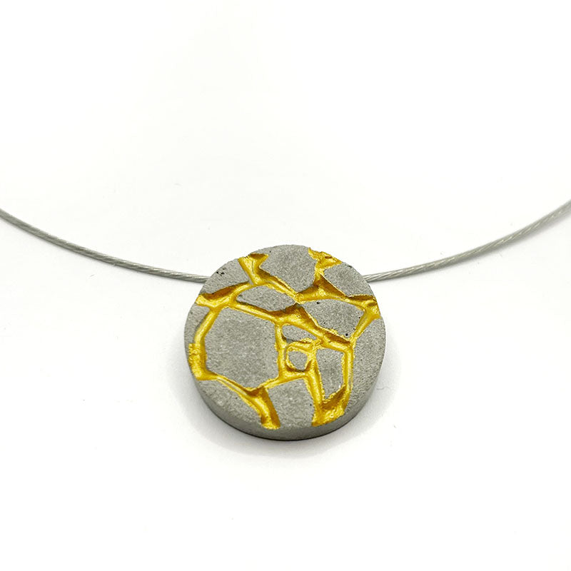 The Patti necklace made with natural-colored concrete is covered with a golden network that evokes Japanese pottery repaired with the kintsugi technique, to enhance the breakages. Atypical and contemporary, this jewel will certainly have its little effect.