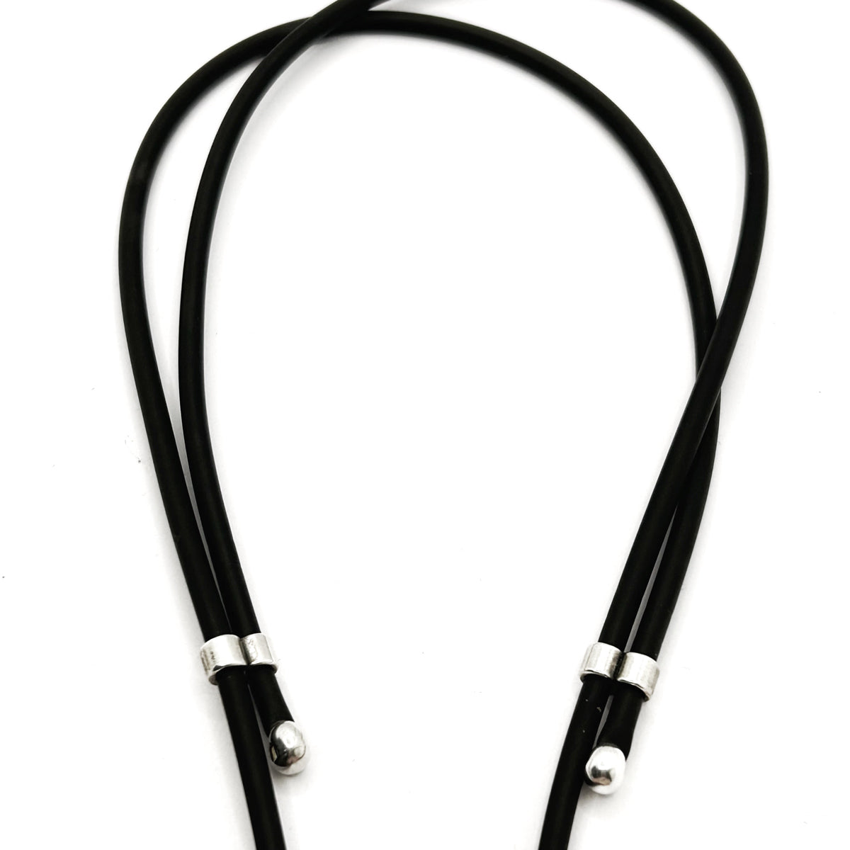 The lace: length 80 cm, in black rubber. Sliding closure that allows you to adjust the height of the pendant to the outfit.
