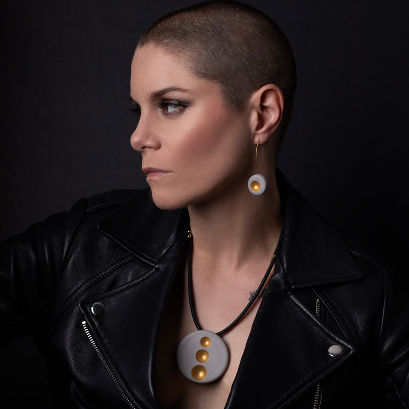 This large concrete necklace features a geometric pattern of three hollows with golden highlights. A true modern sculpture to wear on yourself, its very contemporary design will appeal to lovers of modern art. The adjustable rubber lace allows it to be worn in all circumstances and with all outfits, on a neckline or longer in sautoir mode on a dress.