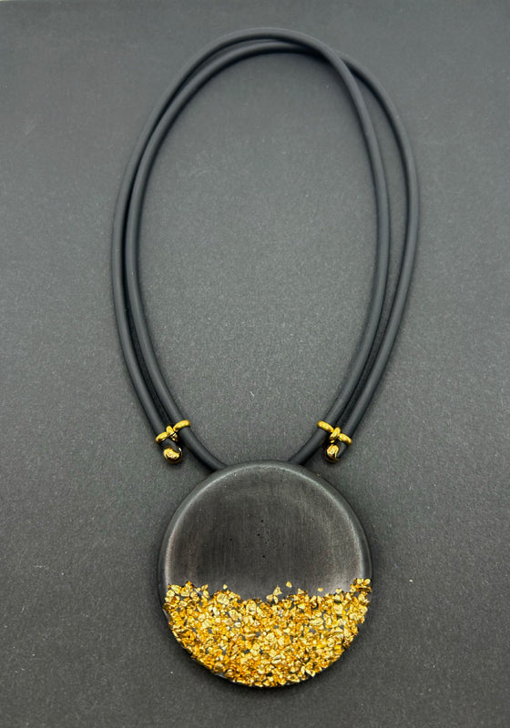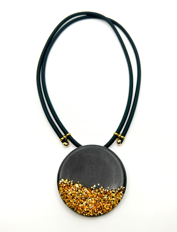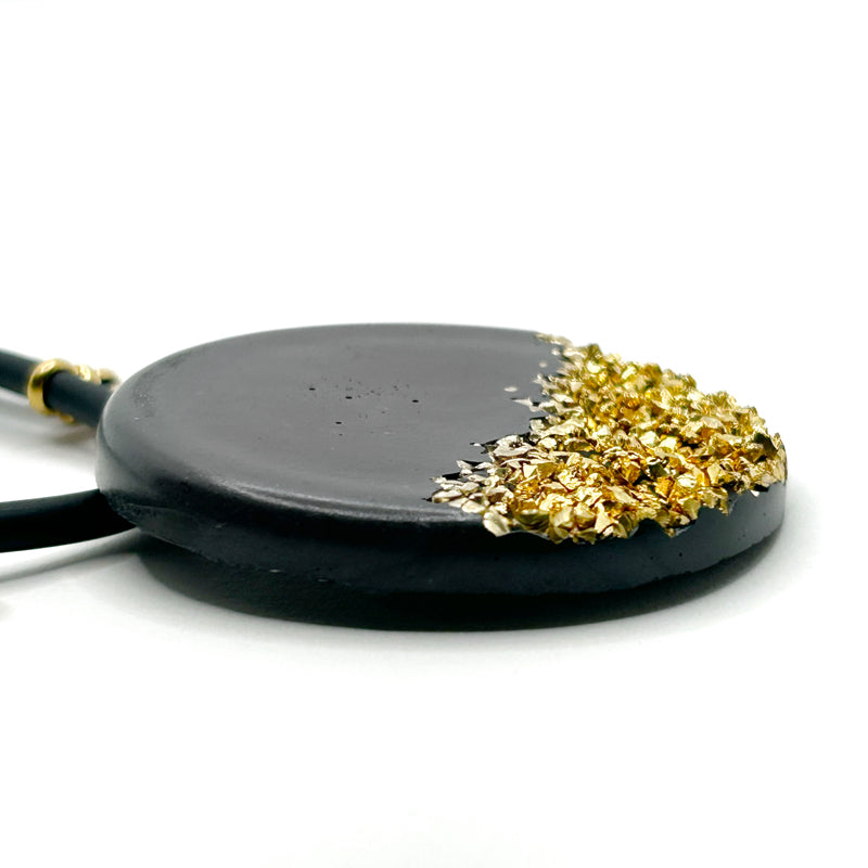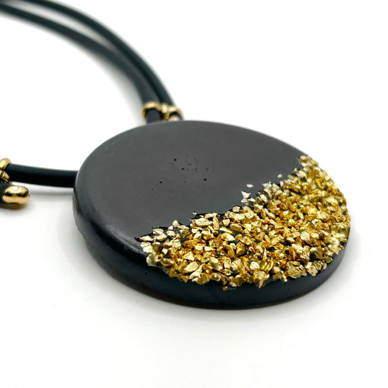The large concrete necklace from the Justine collection explores contrasts: an intense black, mass-tinted concrete, into which golden glass crystals are inserted. It plays with light and raw materials to create a contemporary effect. A piece of jewelry that is at once understated, powerful, and luminous.