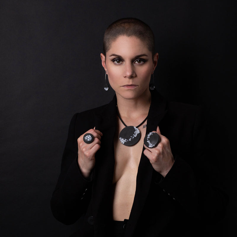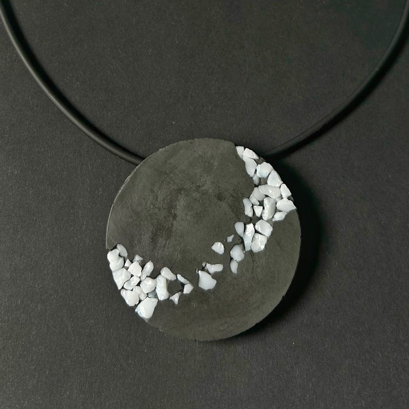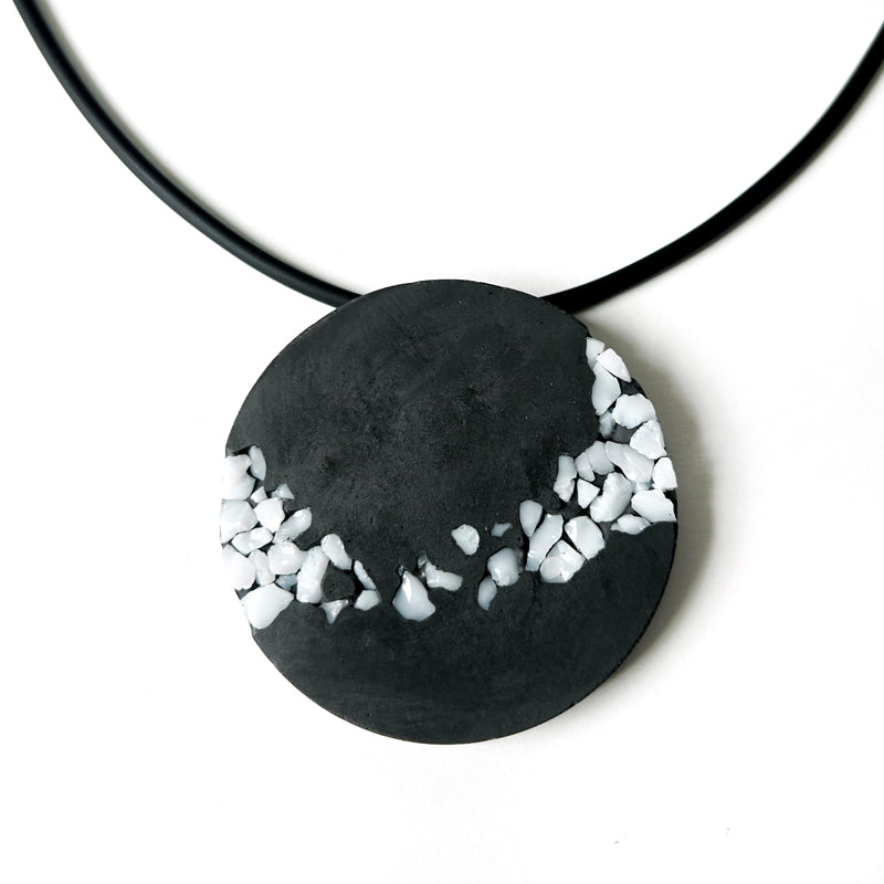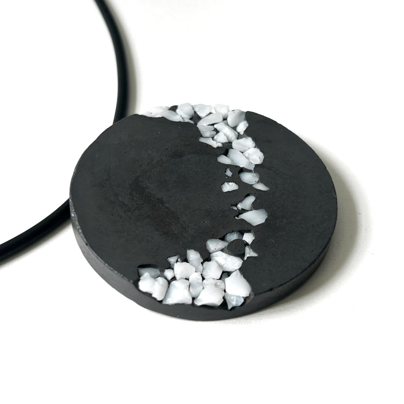 A true centerpiece, this large black concrete pendant inlaid with white glass immediately catches the eye. The glass fragments, arranged organically, capture the light and contrast with the matte surface of the concrete. An exceptional piece of jewelry to assert your personality and taste for contemporary design.