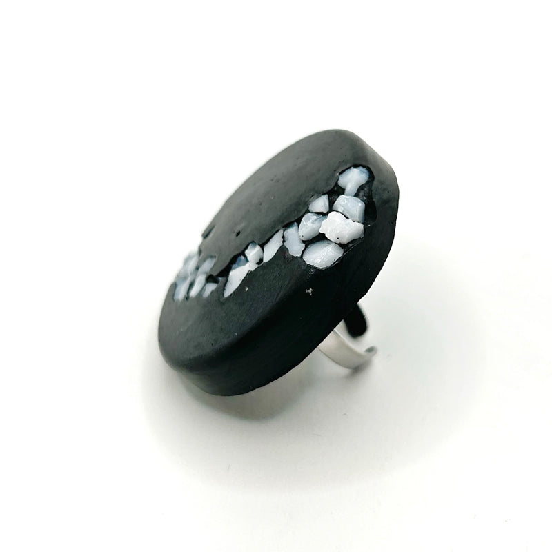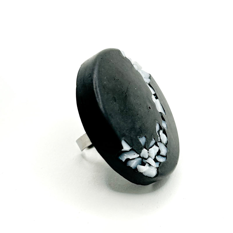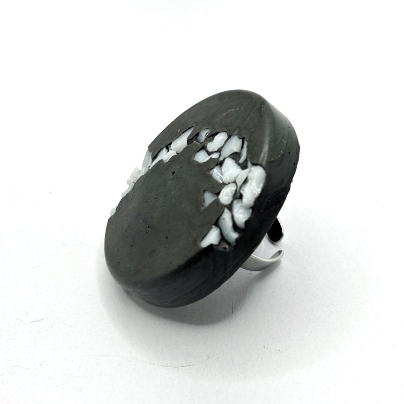 Designed for those who love bold contrasts, the Laetitia ring combines black-tinted concrete with irregular white glass inclusions. Each piece is unique: the glass shards create an organic pattern that captures the light and enhances the raw material. Despite its imposing size, it is very comfortable to wear.