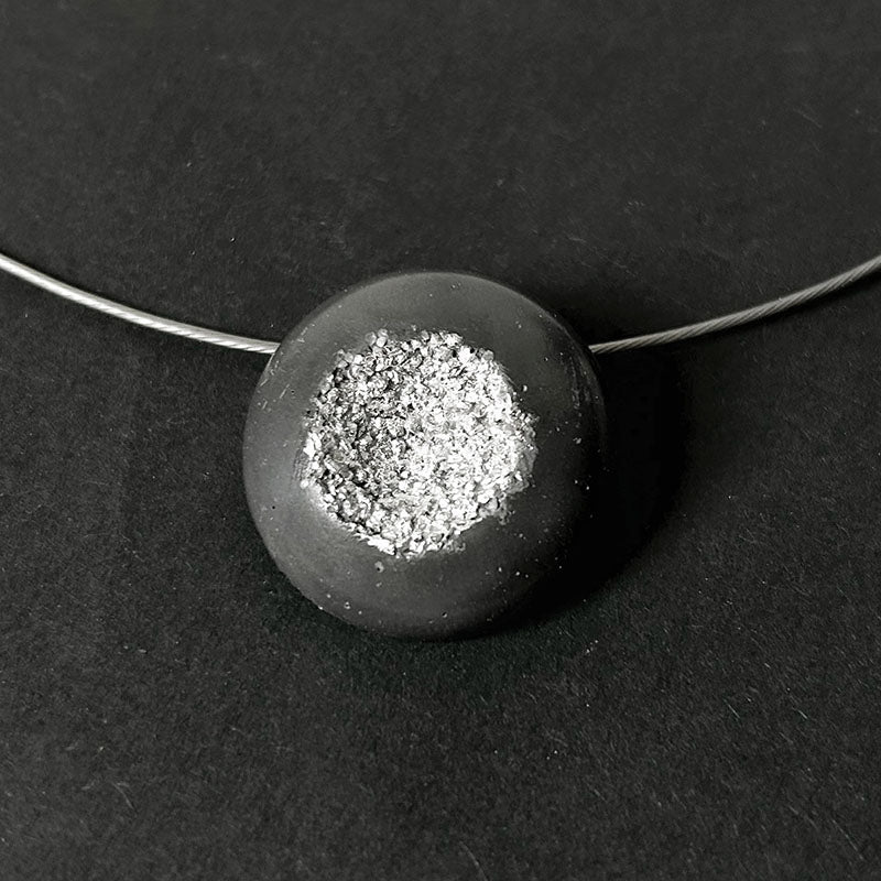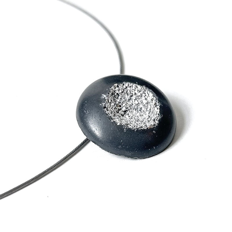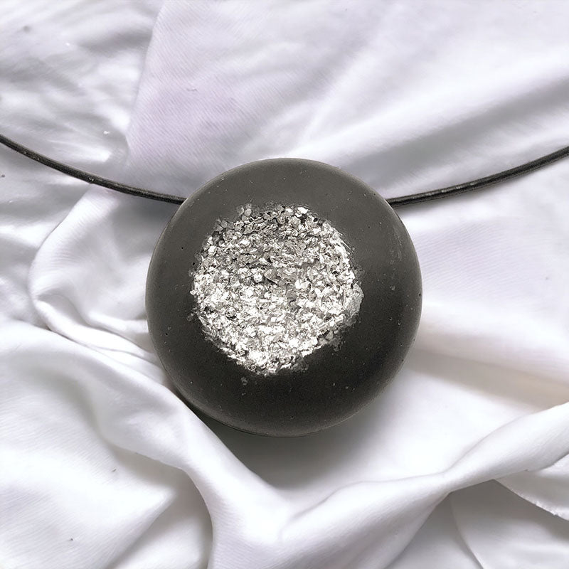 Matériaux du pendentif : béton coloré en noir dans la masse, sable, feuille d'argent.